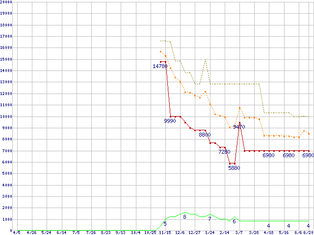 PC3-8500 1GB×3枚組みセットの価格推移↑前グラフ↓次グラフ(2008年4月5日〜2009年6月20日)※このグラフは過去のデータも税率5%相当に調整した税込み相当額のグラフです。 税率変更や、総額表示方式導入(2004年4月)の影響は除いています。●関連グラフメモリ主要製品の最安値推移メモリ主要製品(最安値5千円〜1万円未満)の最安値推移PC3-8500(DDR3-1066) DDR3 SDRAM DIMMの最安値推移●凡例最安値(点線部は販売店未確認または未調査)平均値最高値ショップ数