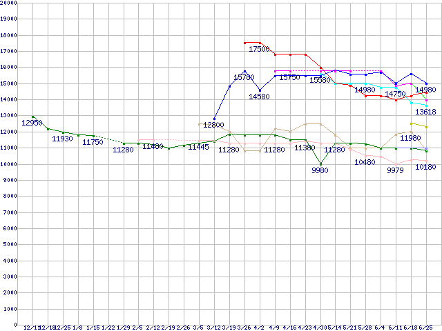 | HDD/SSD主要製品(最安値1万円〜1万5千円未満)の最安値推移 |