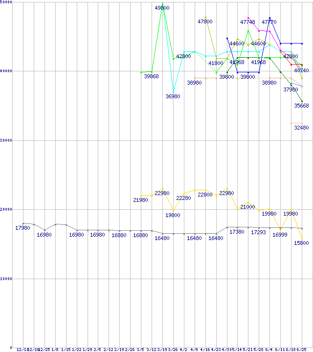 HDD 100〜160GB未満の最安値推移↑前グラフ↓次グラフ(2008年12月11日〜2009年6月25日)※このグラフは過去のデータも税率5%相当に調整した税込み相当額のグラフです。 税率変更や、総額表示方式導入(2004年4月)の影響は除いています。凡例FM-25S2S-128GBF1 (128GB,64MB,MLC)OCZSSD2-1SUM120G (120GB,128MB,MLC)OCZSSD2-1VTX120G (120GB,64MB,MLC)PFZ128GS25SSDR (128GB,64MB,MLC)PF25S128GSSDV3 (128GB,64MB,MLC)MMCRE28G5MXP-0VB (128GB,128MB,MLC)OCZSSD2-1AGT120G (120GB,64MB,MLC)FTM28GX25H (128GB,64MB,MLC)CSSD-SM128NI (128GB,MLC)AS592S-128GM-C (128GB,64MB,MLC)WD1500HLFS (150.0GB)2.5インチSSD 128GB (128GB,MLC)※製品名をクリックすると個別のグラフを表示します※点線部は販売店が確認できなかった、または調査データがないことを示します