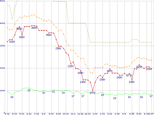 PC2-6400 2GBの価格推移↑前グラフ↓次グラフ(2008年4月12日〜2009年6月27日)※このグラフは過去のデータも税率5%相当に調整した税込み相当額のグラフです。 税率変更や、総額表示方式導入(2004年4月)の影響は除いています。●関連グラフメモリ主要製品の最安値推移1GBモジュールの最安値推移メモリ主要製品(最安値5千円未満)の最安値推移PC2-6400(DDR2-800) DDR2 SDRAM DIMMの最安値推移●凡例最安値(点線部は販売店未確認または未調査)平均値最高値ショップ数