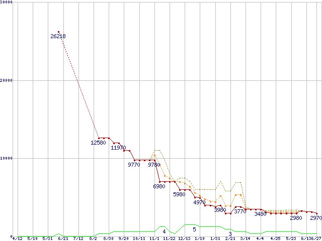 PC3-8500 2GBの価格推移↓次グラフ(2008年4月12日〜2009年6月27日)※このグラフは過去のデータも税率5%相当に調整した税込み相当額のグラフです。 税率変更や、総額表示方式導入(2004年4月)の影響は除いています。●関連グラフメモリ主要製品の最安値推移1GBモジュールの最安値推移メモリ主要製品(最安値5千円未満)の最安値推移PC3-8500(DDR3-1066) DDR3 SDRAM DIMMの最安値推移●凡例最安値(点線部は販売店未確認または未調査)平均値最高値ショップ数