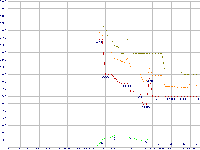 PC3-8500 1GB×3枚組みセットの価格推移↑前グラフ↓次グラフ(2008年4月12日〜2009年6月27日)※このグラフは過去のデータも税率5%相当に調整した税込み相当額のグラフです。 税率変更や、総額表示方式導入(2004年4月)の影響は除いています。●関連グラフメモリ主要製品の最安値推移メモリ主要製品(最安値5千円〜1万円未満)の最安値推移PC3-8500(DDR3-1066) DDR3 SDRAM DIMMの最安値推移●凡例最安値(点線部は販売店未確認または未調査)平均値最高値ショップ数