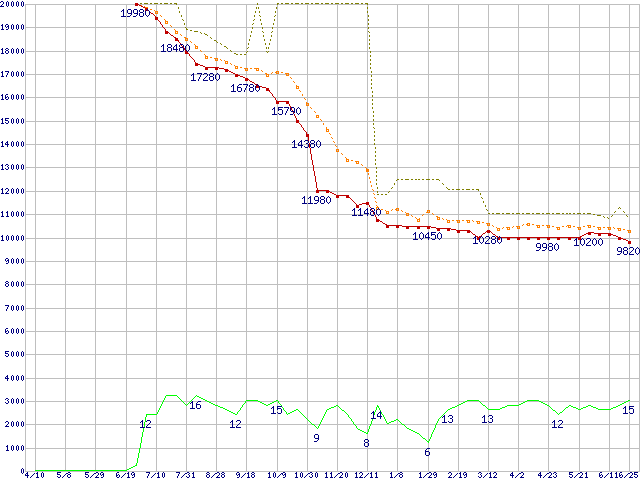 WD1001FALS (1TB,32MB)の価格推移↑前グラフ↓次グラフ(2008年4月10日〜2009年6月25日)※このグラフは過去のデータも税率5%相当に調整した税込み相当額のグラフです。 税率変更や、総額表示方式導入(2004年4月)の影響は除いています。●関連グラフHDD/SSD主要製品の最安値推移HDD/SSD主要製品(最安値1万円未満)の最安値推移HDD 1TB〜1.5TB未満の最安値推移WD Caviar Black (7200rpm,3Gb/s)の最安値推移●凡例最安値(点線部は販売店未確認または未調査)平均値最高値ショップ数