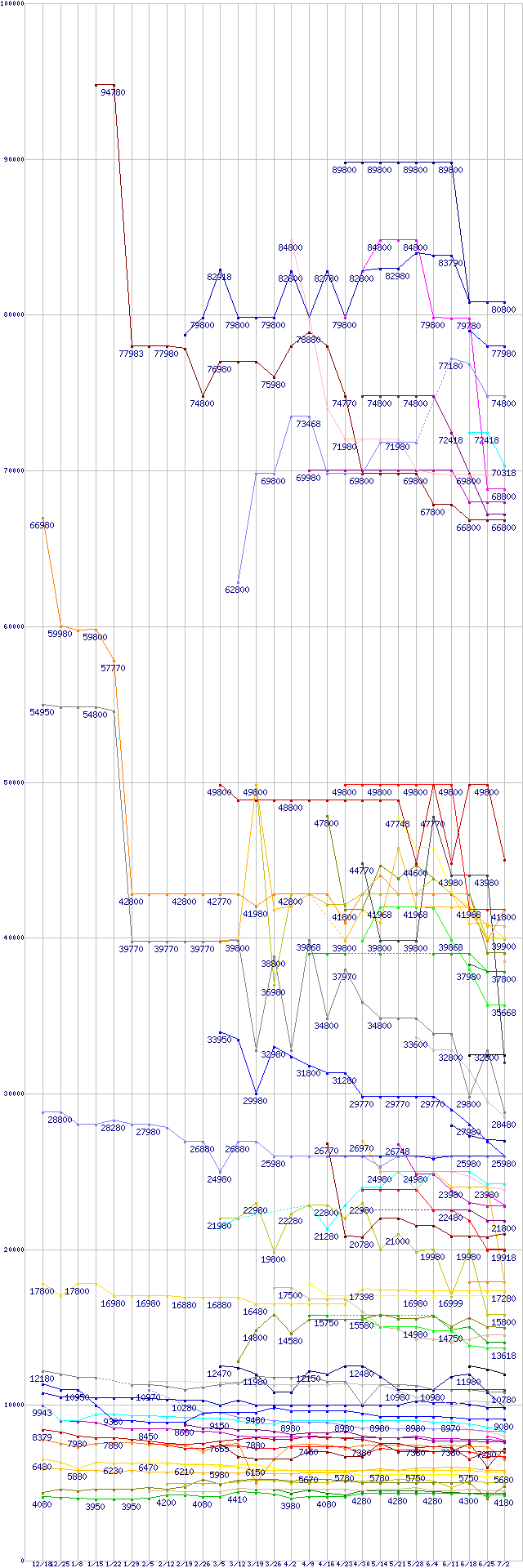 HDD/SSD主要製品の最安値推移↑前グラフ↓次グラフ(2008年12月18日〜2009年7月2日)※このグラフは過去のデータも税率5%相当に調整した税込み相当額のグラフです。 税率変更や、総額表示方式導入(2004年4月)の影響は除いています。凡例GM-25S64GSSDV4 (64GB,64MB,SLC)SSDSA2SH064G1C5 (64GB,SLC)OCZSSD2-1SUM250G (250GB,128MB,MLC)OCZSSD2-1VTX250G (250GB,64MB,MLC)PFZ256GS25SSDR (256GB,64MB,MLC)MMDOE56G5MXP-0VB (256GB,128MB,MLC)PF25S256GSSDV3 (256GB,64MB,MLC)FTM56GX25H (256GB,64MB,MLC)CSSD-SM256NI (256GB,MLC)SSDSA2MH160G1C5 (160GB,MLC)2.5インチSSD 256GB (256GB,MLC)GM-25S32GSSDV4 (32GB,64MB,SLC)SSDSA2SH032G1 (32GB,SLC)OCZSSD2-1VTX120G (120GB,64MB,MLC)OCZSSD2-1SUM120G (120GB,128MB,MLC)PFZ128GS25SSDR (128GB,64MB,MLC)PF25S128GSSDV3 (128GB,64MB,MLC)MMCRE28G5MXP-0VB (128GB,128MB,MLC)SAM28GM25S (128GB,128MB,MLC)OCZSSD2-1AGT120G (120GB,64MB,MLC)FTM28GX25H (128GB,64MB,MLC)CSSD-SM128NI (128GB,MLC)AS592S-128GM-C (128GB,64MB,MLC)FM-25S2S-128GBF1 (128GB,64MB,MLC)SSDSA2MH080G1C5 (80GB,MLC)X25-M(6526-080GR101B) (80GB,MLC)ST32000542AS (2TB,32MB)PF25S64GSSDV3 (64GB,64MB,MLC)WD20EADS (2TB,32MB)WD3000HLFS (300.0GB)OCZSSD2-1VTX60G (60GB,64MB,MLC)OCZSSD2-1SUM60G (60GB,128MB,MLC)OCZSSD2-1AGT60G (60GB,64MB,MLC)PFZ64GS25SSDR (64GB,64MB,MLC)FTM64GX25H (64GB,64MB,MLC)MMCRE64G5MXP-0VB (64GB,128MB,MLC)SAM64GM25S (64GB,128MB,MLC)CSSD-SM64NI (64GB,MLC)AS592S-64GM-C (64GB,32MB,MLC)FM-25S2S-64GBF1 (64GB,64MB,MLC)WD1500HLFS (150.0GB)PF25S32GSSDV3 (32GB,64MB,MLC)2.5インチSSD 128GB (128GB,MLC)OCZSSD2-1VTX30G (30GB,64MB,MLC)WD15EADS (1.5TB,32MB)OCZSSD2-1AGT30G (30GB,64MB,MLC)FTM32GX25H (32GB,64MB,MLC)CSSD-SM32NI (32GB,MLC)ST31500541AS (1.5TB,32MB)AS592S-32GM-C (32GB,32MB,MLC)ST31500341AS (1.5TB,32MB)HD154UI (1.5TB,32MB)2.5インチSSD 64GB (64GB,MLC)WD1001FALS (1TB,32MB)ST9500325AS (500GB,8MB)HTS545050B9A300 (500GB,8MB)WD5000BEVT (500GB,8MB)ST31000520AS (1TB,32MB)HM500JI (500GB,8MB)HM500LI (500GB,8MB)ST31000528AS (1TB,32MB)2.5インチSSD 32GB (32GB,MLC)HDT721010SLA360 (1TB,16MB)HD103SI (1TB,32MB)WD10EADS (1TB,32MB)WD6400AAKS (640GB)WD3200BEVT (320GB,8MB)HTS545032B9A300 (320GB,8MB)ST3500418AS (500GB,16MB)HDP725050GLA360 (500GB,16MB)HD502HI (500GB,16MB)ST3320418AS (320GB,16MB)HDT721032SLA360 (320GB,16MB)※製品名をクリックすると個別のグラフを表示します※点線部は販売店が確認できなかった、または調査データがないことを示します