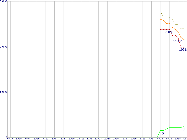 CSSD-SM64NI (64GB,MLC)の価格推移↑前グラフ↓次グラフ(2008年4月17日〜2009年7月2日)※このグラフは過去のデータも税率5%相当に調整した税込み相当額のグラフです。 税率変更や、総額表示方式導入(2004年4月)の影響は除いています。●関連グラフHDD/SSD主要製品の最安値推移HDD/SSD主要製品(最安値1万5千円〜2万円未満)の最安値推移HDD/SSD 60GB〜80GB未満の最安値推移Interceptor (SSD,2.5インチ,リード240〜200MB/s・ライト150〜95MB/s)の最安値推移●凡例最安値(点線部は販売店未確認または未調査)平均値最高値ショップ数