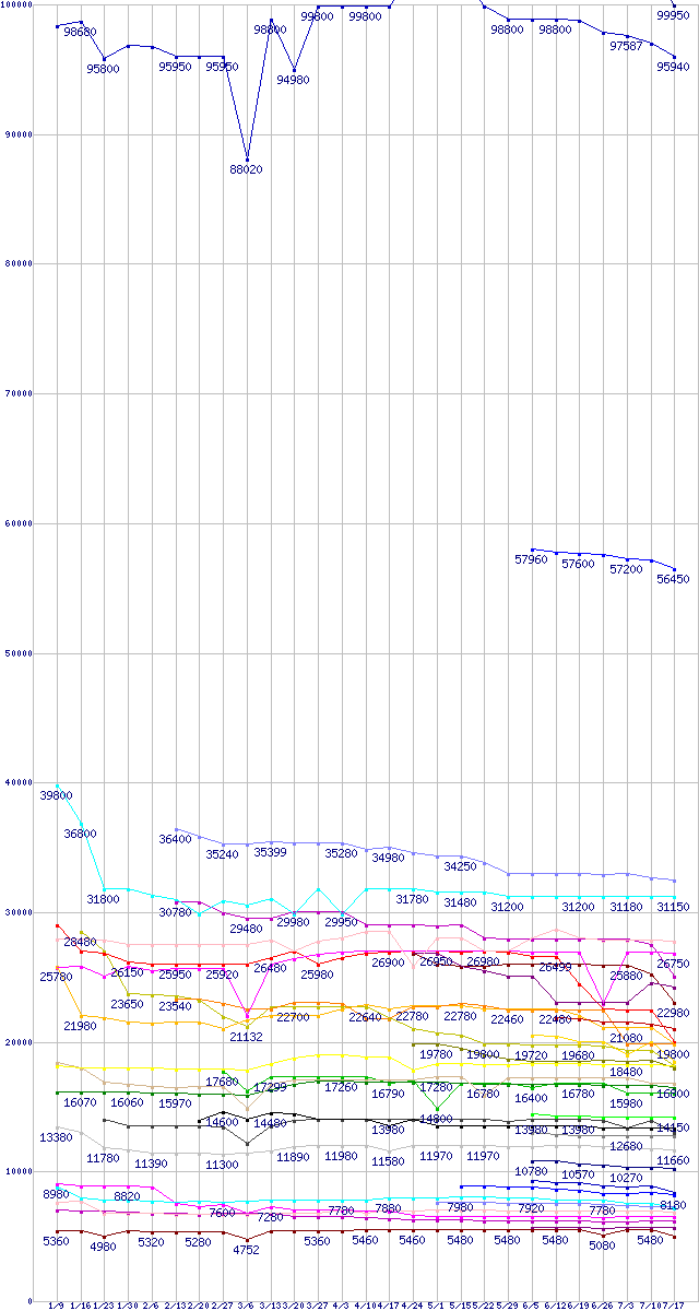CPU主要製品の最安値推移↑前グラフ↓次グラフ(2009年1月9日〜2009年7月17日)※このグラフは過去のデータも税率5%相当に調整した税込み相当額のグラフです。 税率変更や、総額表示方式導入(2004年4月)の影響は除いています。凡例Core i7-975 Extreme Edition (3.33GHz)Core i7-965 Extreme Edition (3.20GHz)Core i7-950 (3.06GHz)Core 2 Quad Q9550S (2.83GHz,L2 6MB×2)Core 2 Quad Q9650 (3.00GHz,L2 6MB×2)Core i7-920 (2.66GHz)Core 2 Duo E8600 (3.33GHz,L2 6MB)Core 2 Quad Q9400S (2.66GHz,L2 3MB×2)Phenom II X4 955 Black Edition (3.2GHz,L2 512KB×4,L3 6MB,TDP 125W)Core 2 Quad Q8400S (2.66GHz,L2 2MB×2)Phenom II X4 945 (3.0GHz,L2 512KB×4,L3 6MB,TDP 95W)Core 2 Quad Q9550 (2.83GHz,L2 6MB×2)Core 2 Quad Q8200S (2.33GHz,L2 2MB×2)Core 2 Quad Q9400 (2.66GHz,L2 3MB×2)Phenom II X4 905e (2.5GHz,L2 512KB×4,L3 6MB)Core 2 Duo E8500 (3.16GHz,L2 6MB)Phenom II X4 940 Black Edition (3.0GHz,L2 512KB×4,L3 6MB)Core 2 Quad Q8400 (2.66GHz,L2 2MB×2)Core 2 Quad Q8200 (2.33GHz,L2 2MB×2)Core 2 Duo E8400 (3GHz,L2 6MB)Phenom II X4 810 (2.6GHz,L2 512KB×4,L3 4MB)Core 2 Duo E7600 (3.06GHz,L2 3MB)Phenom II X3 720 Black Edition (2.8GHz,L2 512KB×3,L3 6MB)Core 2 Duo E7500 (2.93GHz,L2 3MB)Phenom II X3 705e (2.5GHz,L2 512KB×3,L3 6MB)Core 2 Duo E7400 (2.80GHz,L2 3MB)Phenom II X2 550 Black Edition (3.1GHz,L2 512KB×2,L3 6MB)Athlon II X2 250 (3.0GHz,L2 1MB×2)Pentium Dual-Core E6300 (2.8GHz,L2 2MB)Athlon X2 7850 Black Edition (2.8GHz,L2 512KB×2,L3 2MB)Pentium Dual-Core E5300 (2.6GHz,L2 2MB)Pentium Dual-Core E5200 (2.5GHz,L2 2MB)Athlon X2 7750 Black Edition (2.7GHz,L2 512KB×2,L3 2MB)Athlon X2 5050e (2.6GHz,L2 512KB×2)Celeron Dual-Core E1600 (2.4GHz)Celeron Dual-Core E1500 (2.2GHz)※製品名をクリックすると個別のグラフを表示します※点線部は販売店が確認できなかった、または調査データがないことを示します