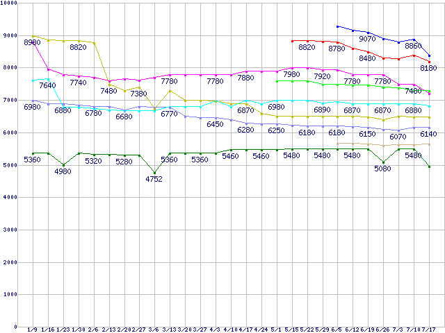 CPU主要製品(最安値1万円未満)の最安値推移↑前グラフ↓次グラフ(2009年1月9日〜2009年7月17日)※このグラフは過去のデータも税率5%相当に調整した税込み相当額のグラフです。 税率変更や、総額表示方式導入(2004年4月)の影響は除いています。凡例Athlon II X2 250 (3.0GHz,L2 1MB×2)Pentium Dual-Core E6300 (2.8GHz,L2 2MB)Athlon X2 7850 Black Edition (2.8GHz,L2 512KB×2,L3 2MB)Pentium Dual-Core E5300 (2.6GHz,L2 2MB)Pentium Dual-Core E5200 (2.5GHz,L2 2MB)Athlon X2 7750 Black Edition (2.7GHz,L2 512KB×2,L3 2MB)Athlon X2 5050e (2.6GHz,L2 512KB×2)Celeron Dual-Core E1600 (2.4GHz)Celeron Dual-Core E1500 (2.2GHz)※製品名をクリックすると個別のグラフを表示します※点線部は販売店が確認できなかった、または調査データがないことを示します