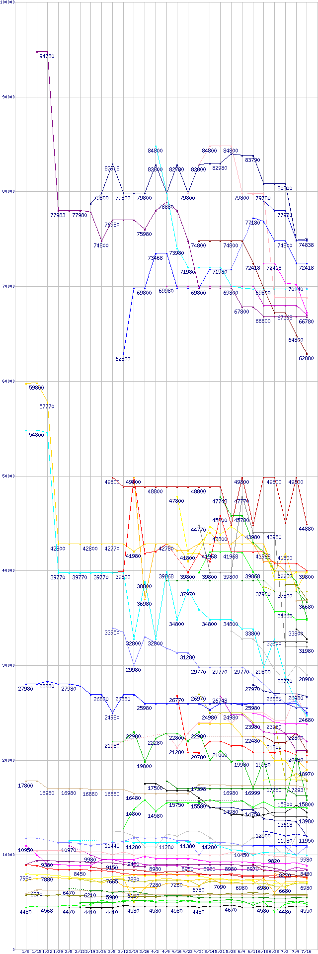 HDD/SSD主要製品の最安値推移↑前グラフ↓次グラフ(2009年1月8日〜2009年7月16日)※このグラフは過去のデータも税率5%相当に調整した税込み相当額のグラフです。 税率変更や、総額表示方式導入(2004年4月)の影響は除いています。凡例SSDSA2SH064G1C5 (64GB,SLC)OCZSSD2-1SUM250G (250GB,128MB,MLC)OCZSSD2-1VTX250G (250GB,64MB,MLC)SP256GBSSDE10S25 (256GB,MLC)MMDOE56G5MXP-0VB (256GB,128MB,MLC)PF25S256GSSDV3 (256GB,64MB,MLC)PFZ256GS25SSDR (256GB,64MB,MLC)FTM56GX25H (256GB,64MB,MLC)SSDSA2MH160G1C5 (160GB,MLC)CSSD-SM256NI (256GB,64MB,MLC)2.5インチSSD 256GB (256GB,MLC)OCZSSD2-1VTX120G (120GB,64MB,MLC)OCZSSD2-1SUM120G (120GB,128MB,MLC)PF25S128GSSDV3 (128GB,64MB,MLC)SSDSA2SH032G1 (32GB,SLC)MMCRE28G5MXP-0VB (128GB,128MB,MLC)OCZSSD2-1AGT120G (120GB,64MB,MLC)SAM28GM25S (128GB,128MB,MLC)SP128GBSSDE10S25 (128GB,MLC)FTM28GX25H (128GB,64MB,MLC)PFZ128GS25SSDR (128GB,64MB,MLC)CSSD-SM128NI (128GB,64MB,MLC)WD2002FYPS (2TB,64MB)AS592S-128GM-C (128GB,64MB,MLC)FM-25S2S-128GBF1 (128GB,64MB,MLC)X25-M(6526-080GR101B) (80GB,MLC)ST32000542AS (2TB,32MB)PF25S64GSSDV3 (64GB,64MB,MLC)WD3000HLFS (300.0GB)WD20EADS (2TB,32MB)SSDSA2MH080G1C5 (80GB,MLC)OCZSSD2-1VTX60G (60GB,64MB,MLC)OCZSSD2-1SUM60G (60GB,128MB,MLC)PFZ64GS25SSDR (64GB,64MB,MLC)OCZSSD2-1AGT60G (60GB,64MB,MLC)FTM64GX25H (64GB,64MB,MLC)SP064GBSSDE10S25 (64GB,MLC)MMCRE64G5MXP-0VB (64GB,128MB,MLC)AS592S-64GM-C Ver.2 (64GB,64MB,MLC)SAM64GM25S (64GB,128MB,MLC)CSSD-SM64NI (64GB,64MB,MLC)AS592S-64GM-C (64GB,32MB,MLC)FM-25S2S-64GBF1 (64GB,64MB,MLC)SP032GBSSDE10S25 (32GB,MLC)WD1500HLFS (150.0GB)PF25S32GSSDV3 (32GB,64MB,MLC)2.5インチSSD 128GB (128GB,MLC)OCZSSD2-1VTX30G (30GB,64MB,MLC)WD15EADS (1.5TB,32MB)OCZSSD2-1AGT30G (30GB,64MB,MLC)FTM32GX25H (32GB,64MB,MLC)2.5インチSSD 64GB (64GB,MLC)CSSD-SM32NI (32GB,32MB,MLC)ST31500541AS (1.5TB,32MB)AS592S-32GM-C (32GB,32MB,MLC)ST31500341AS (1.5TB,32MB)HD154UI (1.5TB,32MB)WD1001FALS (1TB,32MB)ST9500325AS (500GB,8MB)HTS545050B9A300 (500GB,8MB)WD5000BEVT (500GB,8MB)ST31000520AS (1TB,32MB)ST31000528AS (1TB,32MB)HM500LI (500GB,8MB)HM500JI (500GB,8MB)2.5インチSSD 32GB (32GB,MLC)WD10EADS (1TB,32MB)HDT721010SLA360 (1TB,16MB)HD103SI (1TB,32MB)WD6400AAKS (640GB)WD3200BEVT (320GB,8MB)HTS545032B9A300 (320GB,8MB)ST3500418AS (500GB,16MB)HDP725050GLA360 (500GB,16MB)HD502HI (500GB,16MB)※製品名をクリックすると個別のグラフを表示します※点線部は販売店が確認できなかった、または調査データがないことを示します