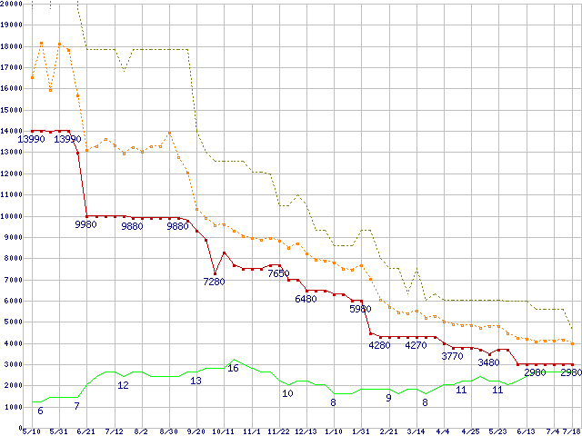 PC3-10600 1GB×2枚組みセットの価格推移↑前グラフ↓次グラフ(2008年5月10日〜2009年7月18日)※このグラフは過去のデータも税率5%相当に調整した税込み相当額のグラフです。 税率変更や、総額表示方式導入(2004年4月)の影響は除いています。●関連グラフメモリ主要製品の最安値推移1GBモジュールの最安値推移メモリ主要製品(最安値5千円未満)の最安値推移PC3-10600(DDR3-1333) DDR3 SDRAM DIMMの最安値推移●凡例最安値(点線部は販売店未確認または未調査)平均値最高値ショップ数
