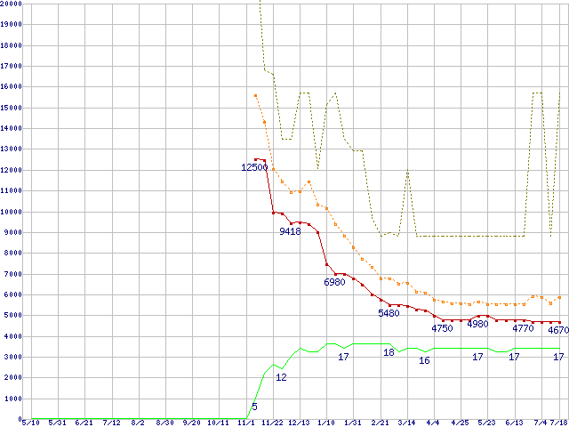 PC3-10600 1GB×3枚組みセットの価格推移↑前グラフ↓次グラフ(2008年5月10日〜2009年7月18日)※このグラフは過去のデータも税率5%相当に調整した税込み相当額のグラフです。 税率変更や、総額表示方式導入(2004年4月)の影響は除いています。●関連グラフメモリ主要製品の最安値推移メモリ主要製品(最安値5千円未満)の最安値推移PC3-10600(DDR3-1333) DDR3 SDRAM DIMMの最安値推移●凡例最安値(点線部は販売店未確認または未調査)平均値最高値ショップ数