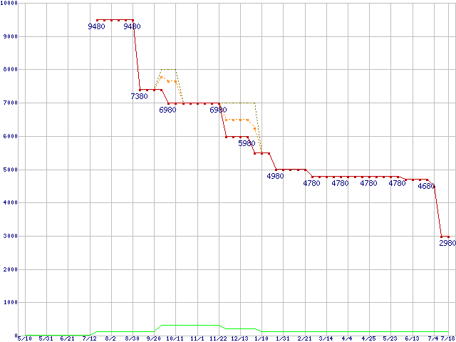 PC3-12800 1GBの価格推移↑前グラフ↓次グラフ(2008年5月10日〜2009年7月18日)※このグラフは過去のデータも税率5%相当に調整した税込み相当額のグラフです。 税率変更や、総額表示方式導入(2004年4月)の影響は除いています。●関連グラフメモリ主要製品の最安値推移1GBモジュールの最安値推移メモリ主要製品(最安値5千円未満)の最安値推移PC3-12800(DDR3-1600) DDR3 SDRAM DIMMの最安値推移●凡例最安値(点線部は販売店未確認または未調査)平均値最高値ショップ数