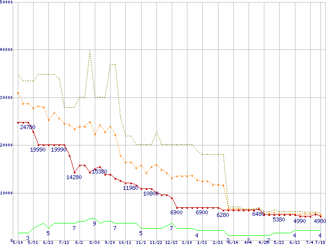 PC3-12800 1GB×2枚組みセットの価格推移↑前グラフ↓次グラフ(2008年5月10日〜2009年7月18日)※このグラフは過去のデータも税率5%相当に調整した税込み相当額のグラフです。 税率変更や、総額表示方式導入(2004年4月)の影響は除いています。●関連グラフメモリ主要製品の最安値推移1GBモジュールの最安値推移メモリ主要製品(最安値5千円未満)の最安値推移PC3-12800(DDR3-1600) DDR3 SDRAM DIMMの最安値推移●凡例最安値(点線部は販売店未確認または未調査)平均値最高値ショップ数