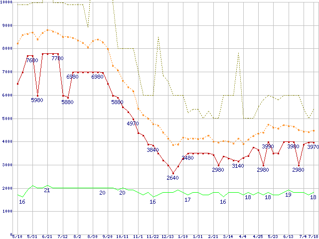 PC2-6400 2GB×2枚組みセットの価格推移↑前グラフ↓次グラフ(2008年5月10日〜2009年7月18日)※このグラフは過去のデータも税率5%相当に調整した税込み相当額のグラフです。 税率変更や、総額表示方式導入(2004年4月)の影響は除いています。●関連グラフメモリ主要製品の最安値推移1GBモジュールの最安値推移メモリ主要製品(最安値5千円未満)の最安値推移PC2-6400(DDR2-800) DDR2 SDRAM DIMMの最安値推移●凡例最安値(点線部は販売店未確認または未調査)平均値最高値ショップ数