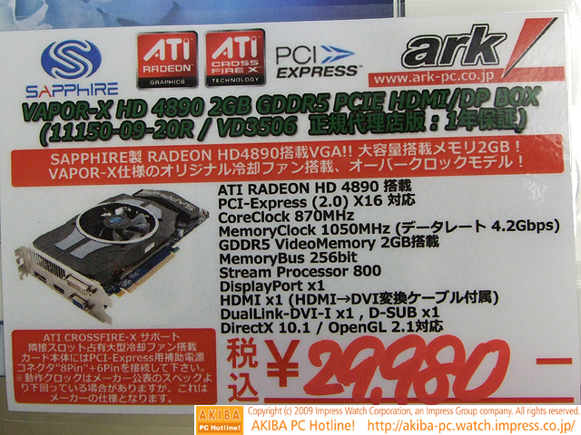 ![]() | AKIBA PC Hotline! 2009年7月18日号 メモリ2GB/OC仕様のRadeon HD 4890が初登場 今週見つけた新製品:ビデオカード SAPPHIRE VAPOR-X HD4890 2GB GDDR5 PCIE HDMI/DP/DVI-I/VGA |