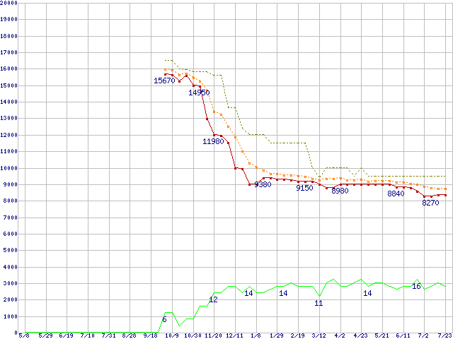 WD5000BEVT (500GB,8MB)の価格推移↑前グラフ↓次グラフ(2008年5月8日〜2009年7月23日)※このグラフは過去のデータも税率5%相当に調整した税込み相当額のグラフです。 税率変更や、総額表示方式導入(2004年4月)の影響は除いています。●関連グラフHDD/SSD主要製品の最安値推移HDD/SSD主要製品(最安値1万円未満)の最安値推移HDD 500〜600GB未満の最安値推移WD Scorpio Blue (5400rpm,3Gb/s,2.5インチ)の最安値推移●凡例最安値(点線部は販売店未確認または未調査)平均値最高値ショップ数