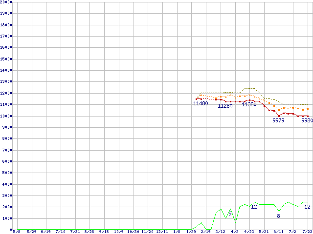 HD154UI (1.5TB,32MB)の価格推移↑前グラフ↓次グラフ(2008年5月8日〜2009年7月23日)※このグラフは過去のデータも税率5%相当に調整した税込み相当額のグラフです。 税率変更や、総額表示方式導入(2004年4月)の影響は除いています。●関連グラフHDD/SSD主要製品の最安値推移HDD/SSD主要製品(最安値1万円未満)の最安値推移HDD 1.5TB以上の最安値推移EcoGreen F2 (5400rpm,3Gb/s)の最安値推移●凡例最安値(点線部は販売店未確認または未調査)平均値最高値ショップ数