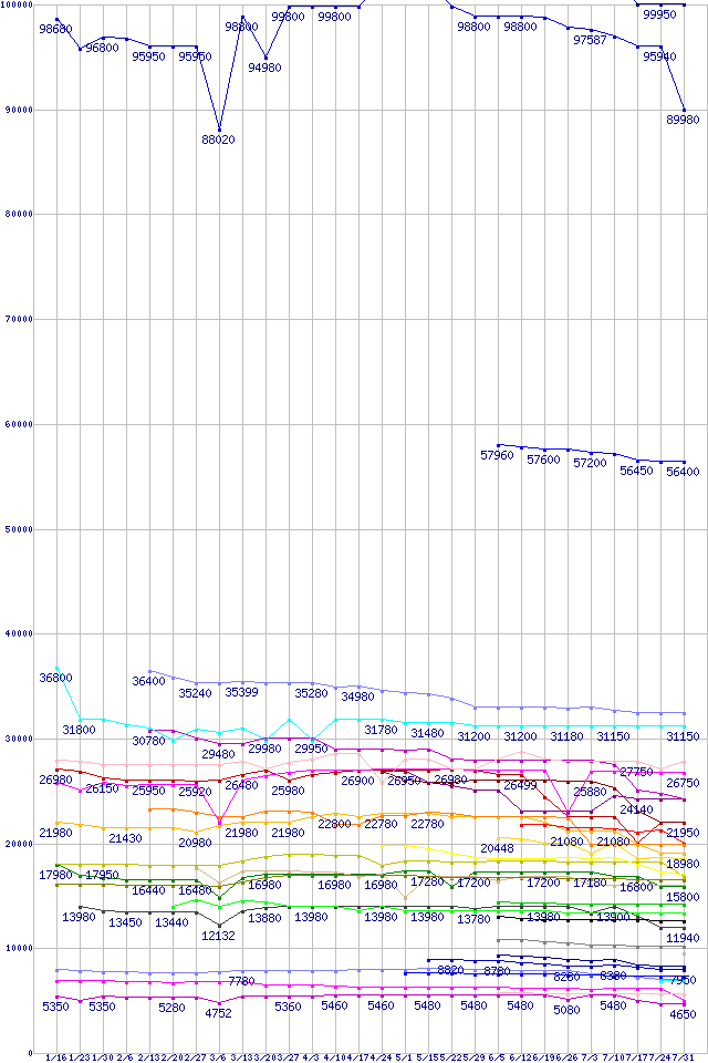 CPU主要製品の最安値推移↑前グラフ↓次グラフ(2009年1月16日〜2009年7月31日)※このグラフは過去のデータも税率5%相当に調整した税込み相当額のグラフです。 税率変更や、総額表示方式導入(2004年4月)の影響は除いています。凡例Core i7-975 Extreme Edition (3.33GHz)Core i7-965 Extreme Edition (3.20GHz)Core i7-950 (3.06GHz)Core 2 Quad Q9550S (2.83GHz,L2 6MB×2)Core 2 Quad Q9650 (3.00GHz,L2 6MB×2)Core i7-920 (2.66GHz)Core 2 Duo E8600 (3.33GHz,L2 6MB)Core 2 Quad Q9400S (2.66GHz,L2 3MB×2)Phenom II X4 955 Black Edition (3.2GHz,L2 512KB×4,L3 6MB,TDP 125W)Core 2 Quad Q8400S (2.66GHz,L2 2MB×2)Core 2 Quad Q9550 (2.83GHz,L2 6MB×2)Phenom II X4 945 (3.0GHz,L2 512KB×4,L3 6MB,TDP 95W)Core 2 Quad Q8200S (2.33GHz,L2 2MB×2)Core 2 Quad Q9400 (2.66GHz,L2 3MB×2)Phenom II X4 905e (2.5GHz,L2 512KB×4,L3 6MB)Core 2 Quad Q8400 (2.66GHz,L2 2MB×2)Core 2 Duo E8500 (3.16GHz,L2 6MB)Core 2 Duo E8400 (3GHz,L2 6MB)Phenom II X4 810 (2.6GHz,L2 512KB×4,L3 4MB)Core 2 Quad Q8200 (2.33GHz,L2 2MB×2)Core 2 Duo E7600 (3.06GHz,L2 3MB)Phenom II X3 720 Black Edition (2.8GHz,L2 512KB×3,L3 6MB)Phenom II X3 705e (2.5GHz,L2 512KB×3,L3 6MB)Core 2 Duo E7500 (2.93GHz,L2 3MB)Phenom II X2 550 Black Edition (3.1GHz,L2 512KB×2,L3 6MB)Phenom II X2 545 (3.0GHz,L2 512KB×2,L3 6MB)Athlon II X2 250 (3.0GHz,L2 1MB×2)Pentium Dual-Core E6300 (2.8GHz,L2 2MB)Athlon X2 7850 Black Edition (2.8GHz,L2 512KB×2,L3 2MB)Pentium Dual-Core E5300 (2.6GHz,L2 2MB)Athlon II X2 245 (2.9GHz,L2 1MB×2)Celeron Dual-Core E1600 (2.4GHz)Athlon X2 5050e (2.6GHz,L2 512KB×2)Celeron Dual-Core E1500 (2.2GHz)※製品名をクリックすると個別のグラフを表示します※点線部は販売店が確認できなかった、または調査データがないことを示します