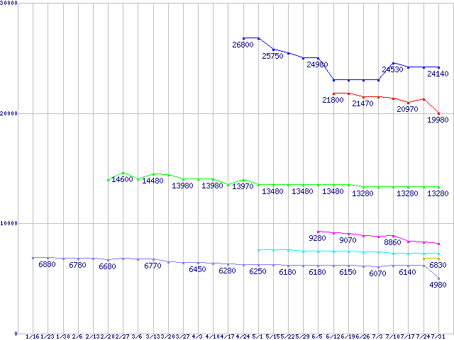 AMD系CPUの最安値推移↑前グラフ↓次グラフ(2009年1月16日〜2009年7月31日)※このグラフは過去のデータも税率5%相当に調整した税込み相当額のグラフです。 税率変更や、総額表示方式導入(2004年4月)の影響は除いています。凡例Phenom II X4 955 Black Edition (3.2GHz,L2 512KB×4,L3 6MB,TDP 125W)Phenom II X4 945 (3.0GHz,L2 512KB×4,L3 6MB,TDP 95W)Phenom II X3 720 Black Edition (2.8GHz,L2 512KB×3,L3 6MB)Athlon II X2 250 (3.0GHz,L2 1MB×2)Athlon X2 7850 Black Edition (2.8GHz,L2 512KB×2,L3 2MB)Athlon II X2 245 (2.9GHz,L2 1MB×2)Athlon X2 5050e (2.6GHz,L2 512KB×2)※製品名をクリックすると個別のグラフを表示します※点線部は販売店が確認できなかった、または調査データがないことを示します