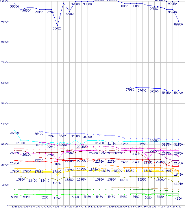 Intel系CPUの最安値推移↑前グラフ↓次グラフ(2009年1月16日〜2009年7月31日)※このグラフは過去のデータも税率5%相当に調整した税込み相当額のグラフです。 税率変更や、総額表示方式導入(2004年4月)の影響は除いています。凡例Core i7-975 Extreme Edition (3.33GHz)Core i7-965 Extreme Edition (3.20GHz)Core i7-950 (3.06GHz)Core 2 Quad Q9550S (2.83GHz,L2 6MB×2)Core 2 Quad Q9650 (3.00GHz,L2 6MB×2)Core i7-920 (2.66GHz)Core 2 Duo E8600 (3.33GHz,L2 6MB)Core 2 Quad Q9400S (2.66GHz,L2 3MB×2)Core 2 Quad Q8400S (2.66GHz,L2 2MB×2)Core 2 Quad Q9550 (2.83GHz,L2 6MB×2)Core 2 Quad Q8200S (2.33GHz,L2 2MB×2)Core 2 Quad Q9400 (2.66GHz,L2 3MB×2)Core 2 Quad Q8400 (2.66GHz,L2 2MB×2)Core 2 Duo E8500 (3.16GHz,L2 6MB)Core 2 Duo E8400 (3GHz,L2 6MB)Core 2 Quad Q8200 (2.33GHz,L2 2MB×2)Core 2 Duo E7600 (3.06GHz,L2 3MB)Core 2 Duo E7500 (2.93GHz,L2 3MB)Pentium Dual-Core E6300 (2.8GHz,L2 2MB)Pentium Dual-Core E5300 (2.6GHz,L2 2MB)Celeron Dual-Core E1600 (2.4GHz)Celeron Dual-Core E1500 (2.2GHz)※製品名をクリックすると個別のグラフを表示します※点線部は販売店が確認できなかった、または調査データがないことを示します