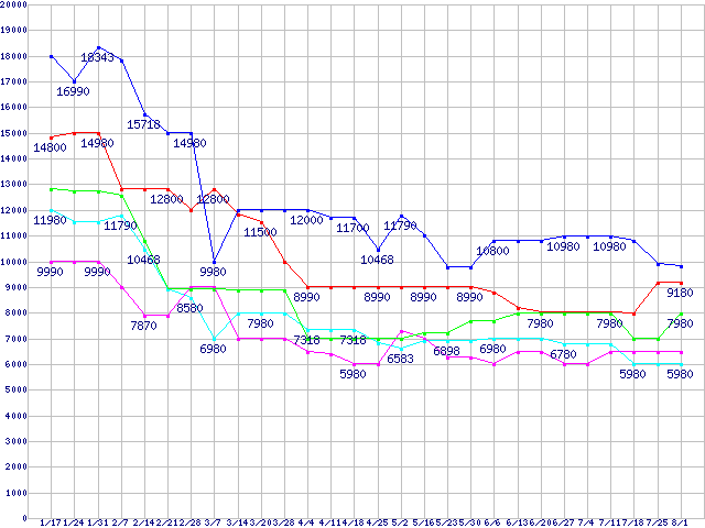| メモリ主要製品(最安値5千円〜1万円未満)の最安値推移 |