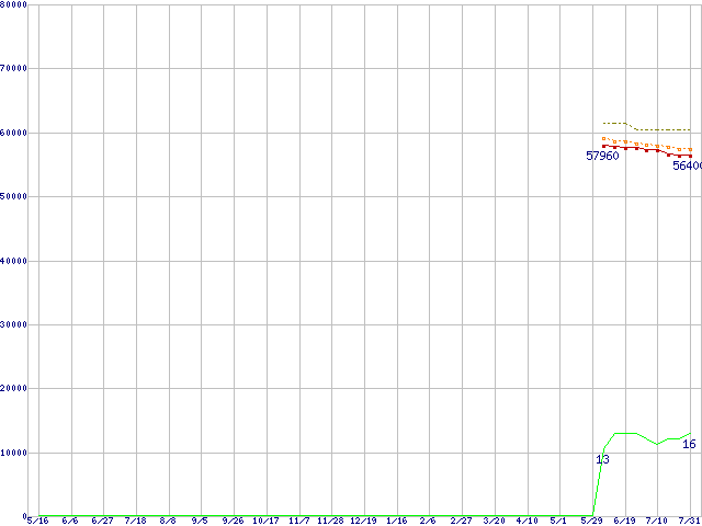 Core i7-950 (3.06GHz)の価格推移↑前グラフ↓次グラフ(2008年5月16日〜2009年7月31日)※このグラフは過去のデータも税率5%相当に調整した税込み相当額のグラフです。 税率変更や、総額表示方式導入(2004年4月)の影響は除いています。●関連グラフCPU主要製品の最安値推移CPU主要製品(最安値3万円〜6万円未満)の最安値推移Intel系CPUの最安値推移LGA1366 (QPI 4.8GT/s,L3キャッシュ8MB,Quad Core,Hyper-Threading)の最安値推移●凡例最安値(点線部は販売店未確認または未調査)平均値最高値ショップ数