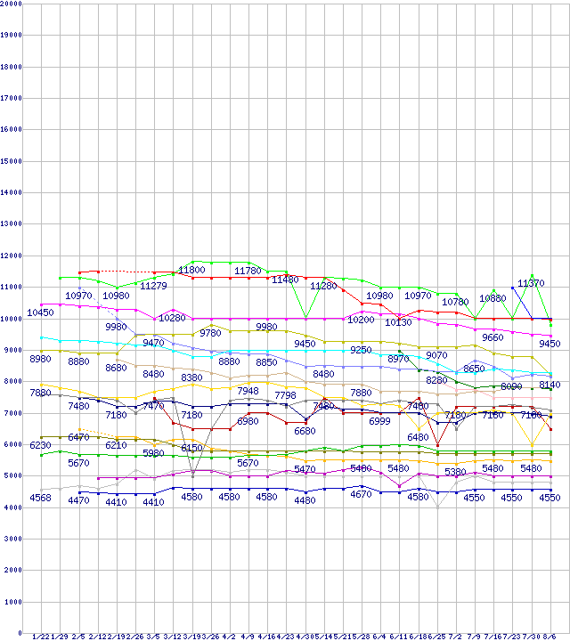 HDD/SSD主要製品(最安値1万円未満)の最安値推移↑前グラフ↓次グラフ(2009年1月22日〜2009年8月6日)※このグラフは過去のデータも税率5%相当に調整した税込み相当額のグラフです。 税率変更や、総額表示方式導入(2004年4月)の影響は除いています。凡例2.5インチSSD(INDILINX製コントローラ) 32GB (32GB,MLC)HD154UI (1.5TB,32MB)ST31500341AS (1.5TB,32MB)WD1001FALS (1TB,32MB)WD5000BEVT (500GB,8MB)ST9500325AS (500GB,8MB)HTS545050B9A300 (500GB,8MB)ST31000528AS (1TB,32MB)ST31000520AS (1TB,32MB)HM500JI (500GB,8MB)WD10EADS (1TB,32MB)HDT721010SLA360 (1TB,16MB)HD103SI (1TB,32MB)2.5インチSSD 32GB (32GB,MLC)WD6400AAKS (640GB)WD3200BEVT (320GB,8MB)HTS545032B9A300 (320GB,8MB)ST3500418AS (500GB,16MB)HDP725050GLA360 (500GB,16MB)HD502HI (500GB,16MB)※製品名をクリックすると個別のグラフを表示します※点線部は販売店が確認できなかった、または調査データがないことを示します