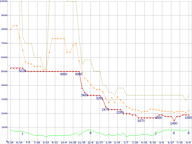 PC3-10600 1GBの価格推移↓次グラフ(2008年5月24日〜2009年8月8日)※このグラフは過去のデータも税率5%相当に調整した税込み相当額のグラフです。 税率変更や、総額表示方式導入(2004年4月)の影響は除いています。●関連グラフメモリ主要製品の最安値推移1GBモジュールの最安値推移メモリ主要製品(最安値5千円未満)の最安値推移PC3-10600(DDR3-1333) DDR3 SDRAM DIMMの最安値推移●凡例最安値(点線部は販売店未確認または未調査)平均値最高値ショップ数