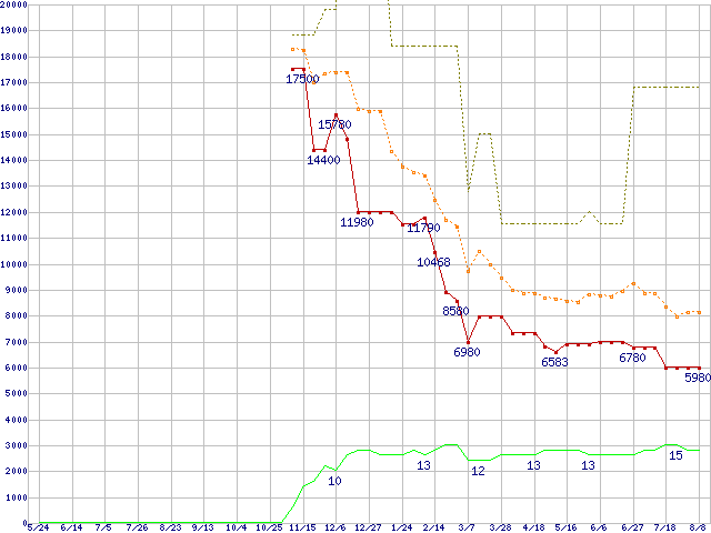 PC3-12800 1GB×3枚組みセットの価格推移↑前グラフ↓次グラフ(2008年5月24日〜2009年8月8日)※このグラフは過去のデータも税率5%相当に調整した税込み相当額のグラフです。 税率変更や、総額表示方式導入(2004年4月)の影響は除いています。●関連グラフメモリ主要製品の最安値推移メモリ主要製品(最安値5千円〜1万円未満)の最安値推移PC3-12800(DDR3-1600) DDR3 SDRAM DIMMの最安値推移●凡例最安値(点線部は販売店未確認または未調査)平均値最高値ショップ数