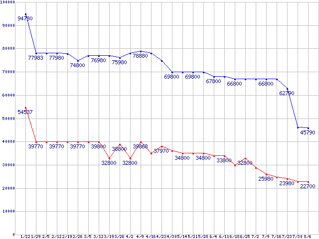 | X25-M Mainstream SATA SSD (SSD,3Gb/s,2.5インチ,リード250MB/s・ライト70MB/s)の最安値推移 |