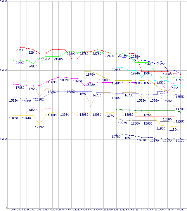 CPU主要製品(最安値1万円〜2万円未満)の最安値推移↑前グラフ↓次グラフ(2009年2月6日〜2009年8月21日)※このグラフは過去のデータも税率5%相当に調整した税込み相当額のグラフです。 税率変更や、総額表示方式導入(2004年4月)の影響は除いています。凡例Phenom II X4 945 (3.0GHz,L2 512KB×4,L3 6MB,TDP 95W)Core 2 Quad Q8200S (2.33GHz,L2 2MB×2)Core 2 Quad Q9400 (2.66GHz,L2 3MB×2)Core 2 Duo E8500 (3.16GHz,L2 6MB)Phenom II X4 905e (2.5GHz,L2 512KB×4,L3 6MB)Core 2 Quad Q8400 (2.66GHz,L2 2MB×2)Core 2 Duo E8400 (3GHz,L2 6MB)Phenom II X4 810 (2.6GHz,L2 512KB×4,L3 4MB)Core 2 Duo E7600 (3.06GHz,L2 3MB)Phenom II X3 720 Black Edition (2.8GHz,L2 512KB×3,L3 6MB)Phenom II X3 705e (2.5GHz,L2 512KB×3,L3 6MB)Core 2 Duo E7500 (2.93GHz,L2 3MB)Phenom II X2 550 Black Edition (3.1GHz,L2 512KB×2,L3 6MB)※製品名をクリックすると個別のグラフを表示します※点線部は販売店が確認できなかった、または調査データがないことを示します