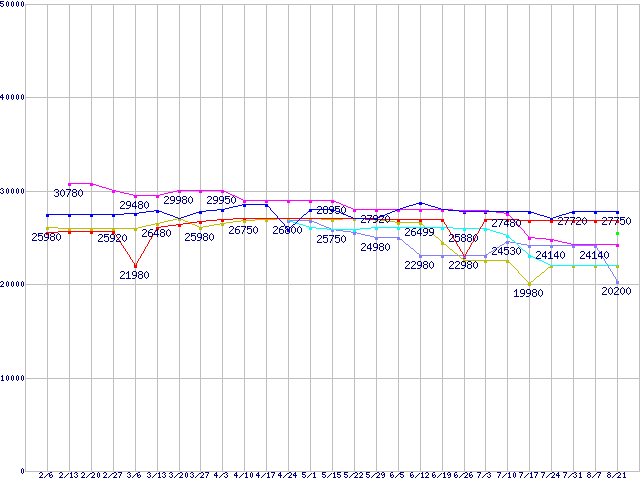 CPU主要製品(最安値2万円〜3万円未満)の最安値推移↑前グラフ↓次グラフ(2009年2月6日〜2009年8月21日)※このグラフは過去のデータも税率5%相当に調整した税込み相当額のグラフです。 税率変更や、総額表示方式導入(2004年4月)の影響は除いています。凡例Core i7-920 (2.66GHz)Core 2 Duo E8600 (3.33GHz,L2 6MB)Phenom II X4 965 Black Edition (3.4GHz,L2 512KB×4,L3 6MB,TDP 140W)Core 2 Quad Q9400S (2.66GHz,L2 3MB×2)Core 2 Quad Q8400S (2.66GHz,L2 2MB×2)Core 2 Quad Q9550 (2.83GHz,L2 6MB×2)Phenom II X4 955 Black Edition (3.2GHz,L2 512KB×4,L3 6MB,TDP 125W)※製品名をクリックすると個別のグラフを表示します※点線部は販売店が確認できなかった、または調査データがないことを示します