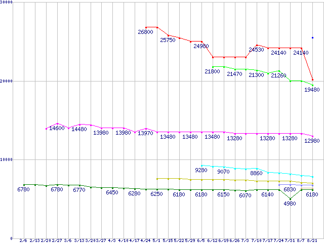 AMD系CPUの最安値推移↑前グラフ↓次グラフ(2009年2月6日〜2009年8月21日)※このグラフは過去のデータも税率5%相当に調整した税込み相当額のグラフです。 税率変更や、総額表示方式導入(2004年4月)の影響は除いています。凡例Phenom II X4 965 Black Edition (3.4GHz,L2 512KB×4,L3 6MB,TDP 140W)Phenom II X4 955 Black Edition (3.2GHz,L2 512KB×4,L3 6MB,TDP 125W)Phenom II X4 945 (3.0GHz,L2 512KB×4,L3 6MB,TDP 95W)Phenom II X3 720 Black Edition (2.8GHz,L2 512KB×3,L3 6MB)Athlon II X2 250 (3.0GHz,L2 1MB×2)Athlon X2 7850 Black Edition (2.8GHz,L2 512KB×2,L3 2MB)Athlon II X2 245 (2.9GHz,L2 1MB×2)Athlon II X2 240 (2.8GHz,L2 1MB×2)Athlon X2 5050e (2.6GHz,L2 512KB×2)※製品名をクリックすると個別のグラフを表示します※点線部は販売店が確認できなかった、または調査データがないことを示します