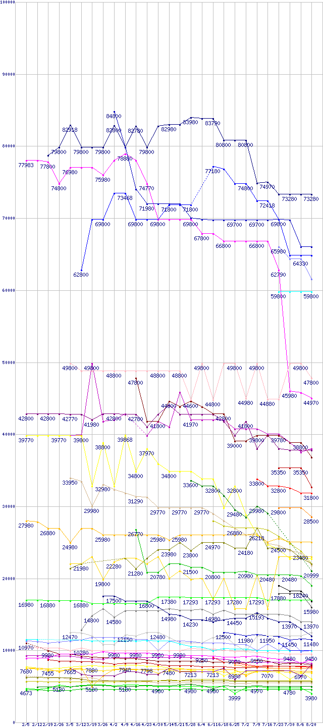 HDD/SSD主要製品の最安値推移↑前グラフ↓次グラフ(2009年2月5日〜2009年8月20日)※このグラフは過去のデータも税率5%相当に調整した税込み相当額のグラフです。 税率変更や、総額表示方式導入(2004年4月)の影響は除いています。凡例SSDSA2SH064G1C5 (64GB,SLC)MMDOE56G5MXP-0VB (256GB,128MB,MLC)OCZSSD2-1VTX250G (250GB,64MB,MLC)2.5インチSSD(SAMSUNG製コントローラ) 256GB (256GB,MLC)2.5インチSSD(INDILINX製コントローラ) 256GB (256GB,MLC)2.5インチSSD 256GB (256GB,MLC)SSDSA2MH160G1C5 (160GB,MLC)OCZSSD2-1VTX120G (120GB,64MB,MLC)SSDSA2SH032G1 (32GB,SLC)MMCRE28G5MXP-0VB (128GB,128MB,MLC)2.5インチSSD(SAMSUNG製コントローラ) 128GB (128GB,MLC)WD2002FYPS (2TB,64MB)2.5インチSSD(INDILINX製コントローラ) 128GB (128GB,MLC)WD3000HLFS (300.0GB)2.5インチSSD 128GB (128GB,MLC)SSDSA2MH080G1C5 (80GB,MLC)ST32000542AS (2TB,32MB)OCZSSD2-1VTX60G (60GB,64MB,MLC)WD20EADS (2TB,32MB)X25-M(6526-080GR101B) (80GB,MLC)MMCRE64G5MXP-0VB (64GB,128MB,MLC)WD1500HLFS (150.0GB)2.5インチSSD(SAMSUNG製コントローラ) 64GB (64GB,MLC)2.5インチSSD(INDILINX製コントローラ) 64GB (64GB,MLC)OCZSSD2-1VTX30G (30GB,64MB,MLC)2.5インチSSD 64GB (64GB,MLC)WD15EADS (1.5TB,32MB)ST31500541AS (1.5TB,32MB)2.5インチSSD(INDILINX製コントローラ) 32GB (32GB,MLC)ST31500341AS (1.5TB,32MB)HD154UI (1.5TB,32MB)WD1001FALS (1TB,32MB)ST9500325AS (500GB,8MB)WD5000BEVT (500GB,8MB)2.5インチSSD 32GB (32GB,MLC)HTS545050B9A300 (500GB,8MB)ST31000528AS (1TB,32MB)ST31000520AS (1TB,32MB)HM500JI (500GB,8MB)WD10EADS (1TB,32MB)HD103SI (1TB,32MB)HDT721010SLA360 (1TB,16MB)WD6400AAKS (640GB)WD3200BEVT (320GB,8MB)HTS545032B9A300 (320GB,8MB)ST3500418AS (500GB,16MB)HD502HI (500GB,16MB)HDP725050GLA360 (500GB,16MB)※製品名をクリックすると個別のグラフを表示します※点線部は販売店が確認できなかった、または調査データがないことを示します