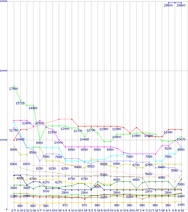 メモリ主要製品の最安値推移↑前グラフ↓次グラフ(2009年2月7日〜2009年8月22日)※このグラフは過去のデータも税率5%相当に調整した税込み相当額のグラフです。 税率変更や、総額表示方式導入(2004年4月)の影響は除いています。凡例PC3-10600 4GBPC2-6400 4GBPC3-12800 2GB×3枚組みセットPC3-12800 2GB×2枚組みセットPC3-10600 2GB×3枚組みセットPC3-10600 2GB×2枚組みセットPC3-12800 1GB×3枚組みセットPC3-10600 1GB×3枚組みセットPC2-6400 2GB×2枚組みセットPC3-12800 1GB×2枚組みセットPC3-12800 1GBPC3-10600 1GB×2枚組みセットPC3-10600 2GBPC2-6400 2GBPC2-6400 1GB×2枚組みセットPC3-10600 1GBPC2-6400 1GB※製品名をクリックすると個別のグラフを表示します※点線部は販売店が確認できなかった、または調査データがないことを示します