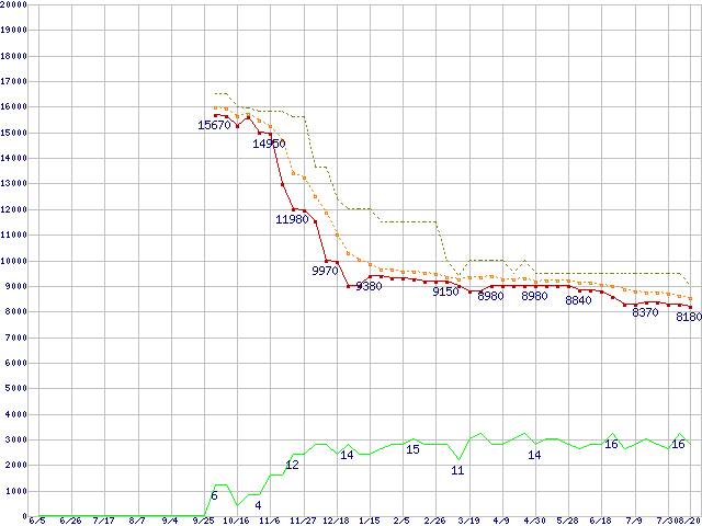 WD5000BEVT (500GB,8MB)の価格推移↑前グラフ↓次グラフ(2008年6月5日〜2009年8月20日)※このグラフは過去のデータも税率5%相当に調整した税込み相当額のグラフです。 税率変更や、総額表示方式導入(2004年4月)の影響は除いています。●関連グラフHDD/SSD主要製品の最安値推移HDD/SSD主要製品(最安値1万円未満)の最安値推移HDD 500〜600GB未満の最安値推移WD Scorpio Blue (5400rpm,3Gb/s,2.5インチ)の最安値推移●凡例最安値(点線部は販売店未確認または未調査)平均値最高値ショップ数