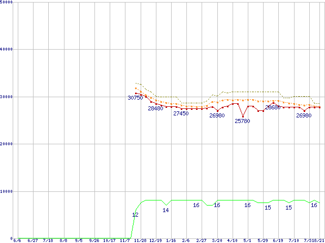 Core i7-920 (2.66GHz)の価格推移↑前グラフ(2008年6月6日〜2009年8月21日)※このグラフは過去のデータも税率5%相当に調整した税込み相当額のグラフです。 税率変更や、総額表示方式導入(2004年4月)の影響は除いています。●関連グラフCPU主要製品の最安値推移CPU主要製品(最安値2万円〜3万円未満)の最安値推移Intel系CPUの最安値推移LGA1366 (QPI 4.8GT/s,L3キャッシュ8MB,Quad Core,Hyper-Threading)の最安値推移●凡例最安値(点線部は販売店未確認または未調査)平均値最高値ショップ数