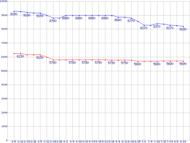 | WD Scorpio Blue (5400rpm,3Gb/s,2.5インチ)の最安値推移 |