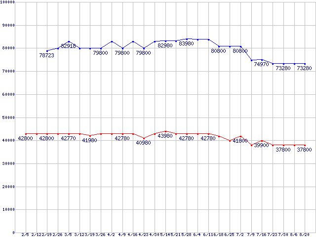 | X25-E Extreme SATA SSD (SSD,3Gb/s,2.5インチ,リード250MB/s・ライト170MB/s)の最安値推移 |
