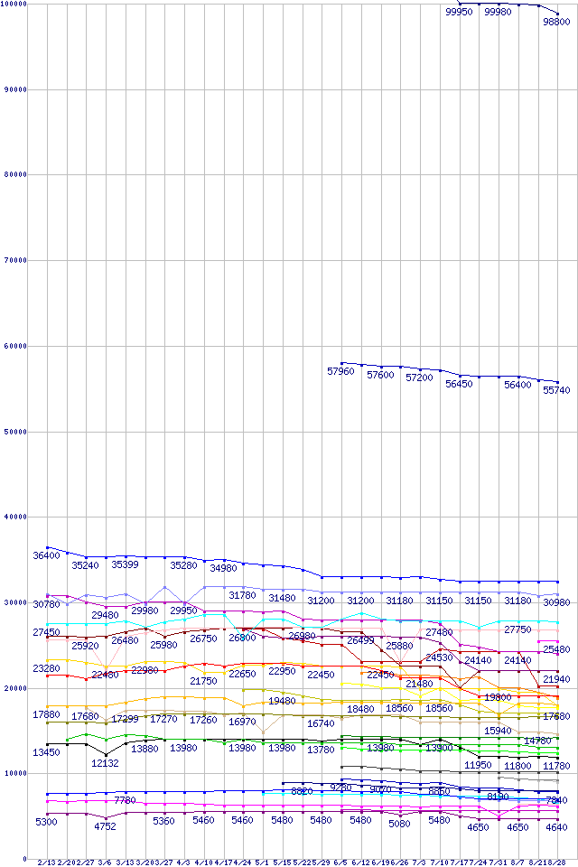 CPU主要製品の最安値推移↑前グラフ↓次グラフ(2009年2月13日〜2009年8月28日)※このグラフは過去のデータも税率5%相当に調整した税込み相当額のグラフです。 税率変更や、総額表示方式導入(2004年4月)の影響は除いています。凡例Core i7-975 Extreme Edition (3.33GHz)Core i7-950 (3.06GHz)Core 2 Quad Q9550S (2.83GHz,L2 6MB×2)Core 2 Quad Q9650 (3.00GHz,L2 6MB×2)Core i7-920 (2.66GHz)Core 2 Duo E8600 (3.33GHz,L2 6MB)Phenom II X4 965 Black Edition (3.4GHz,L2 512KB×4,L3 6MB,TDP 140W)Core 2 Quad Q9400S (2.66GHz,L2 3MB×2)Core 2 Quad Q8400S (2.66GHz,L2 2MB×2)Core 2 Quad Q9550 (2.83GHz,L2 6MB×2)Phenom II X4 955 Black Edition (3.2GHz,L2 512KB×4,L3 6MB,TDP 125W)Core 2 Quad Q9400 (2.66GHz,L2 3MB×2)Phenom II X4 945 (3.0GHz,L2 512KB×4,L3 6MB,TDP 95W)Core 2 Duo E8500 (3.16GHz,L2 6MB)Core 2 Quad Q8200S (2.33GHz,L2 2MB×2)Phenom II X4 905e (2.5GHz,L2 512KB×4,L3 6MB)Core 2 Quad Q8400 (2.66GHz,L2 2MB×2)Core 2 Duo E8400 (3GHz,L2 6MB)Phenom II X4 810 (2.6GHz,L2 512KB×4,L3 4MB)Core 2 Duo E7600 (3.06GHz,L2 3MB)Phenom II X3 720 Black Edition (2.8GHz,L2 512KB×3,L3 6MB)Phenom II X3 705e (2.5GHz,L2 512KB×3,L3 6MB)Core 2 Duo E7500 (2.93GHz,L2 3MB)Phenom II X2 550 Black Edition (3.1GHz,L2 512KB×2,L3 6MB)Phenom II X2 545 (3.0GHz,L2 512KB×2,L3 6MB)Pentium Dual-Core E6500 (2.93GHz,L2 2MB)Pentium Dual-Core E6300 (2.8GHz,L2 2MB)Athlon II X2 250 (3.0GHz,L2 1MB×2)Pentium Dual-Core E5300 (2.6GHz,L2 2MB)Athlon II X2 245 (2.9GHz,L2 1MB×2)Athlon X2 7850 Black Edition (2.8GHz,L2 512KB×2,L3 2MB)Athlon II X2 240 (2.8GHz,L2 1MB×2)Athlon X2 5050e (2.6GHz,L2 512KB×2)Celeron Dual-Core E1600 (2.4GHz)Celeron Dual-Core E1500 (2.2GHz)※製品名をクリックすると個別のグラフを表示します※点線部は販売店が確認できなかった、または調査データがないことを示します
