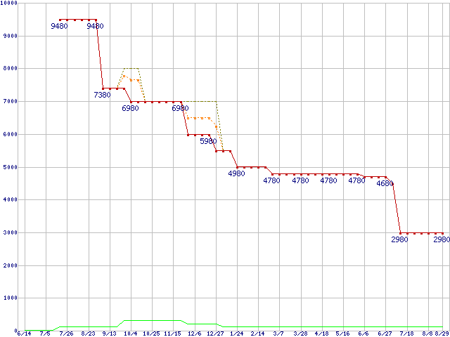 PC3-12800 1GBの価格推移↑前グラフ↓次グラフ(2008年6月14日〜2009年8月29日)※このグラフは過去のデータも税率5%相当に調整した税込み相当額のグラフです。 税率変更や、総額表示方式導入(2004年4月)の影響は除いています。●関連グラフメモリ主要製品の最安値推移1GBモジュールの最安値推移メモリ主要製品(最安値5千円未満)の最安値推移PC3-12800(DDR3-1600) DDR3 SDRAM DIMMの最安値推移●凡例最安値(点線部は販売店未確認または未調査)平均値最高値ショップ数