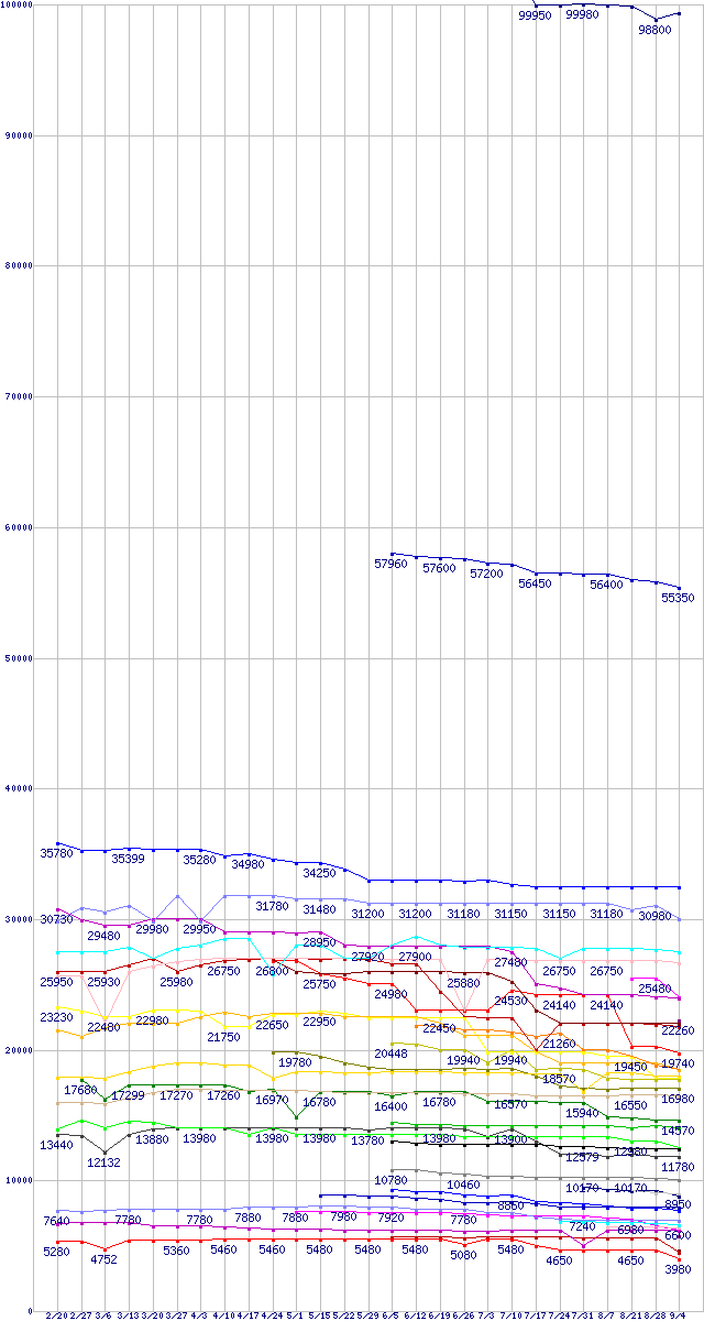 CPU主要製品の最安値推移↑前グラフ↓次グラフ(2009年2月20日〜2009年9月4日)※このグラフは過去のデータも税率5%相当に調整した税込み相当額のグラフです。 税率変更や、総額表示方式導入(2004年4月)の影響は除いています。凡例Core i7-975 Extreme Edition (3.33GHz)Core i7-950 (3.06GHz)Core 2 Quad Q9550S (2.83GHz,L2 6MB×2)Core 2 Quad Q9650 (3.00GHz,L2 6MB×2)Core i7-920 (2.66GHz)Core 2 Duo E8600 (3.33GHz,L2 6MB)Phenom II X4 965 Black Edition (3.4GHz,L2 512KB×4,L3 6MB,TDP 140W)Core 2 Quad Q9400S (2.66GHz,L2 3MB×2)Core 2 Quad Q9505 (2.83GHz,L2 3MB×2)Core 2 Quad Q8400S (2.66GHz,L2 2MB×2)Core 2 Quad Q9550 (2.83GHz,L2 6MB×2)Phenom II X4 955 Black Edition (3.2GHz,L2 512KB×4,L3 6MB,TDP 125W)Phenom II X4 945 (3.0GHz,L2 512KB×4,L3 6MB,TDP 95W)Core 2 Quad Q9400 (2.66GHz,L2 3MB×2)Core 2 Duo E8500 (3.16GHz,L2 6MB)Core 2 Quad Q8200S (2.33GHz,L2 2MB×2)Phenom II X4 905e (2.5GHz,L2 512KB×4,L3 6MB)Core 2 Quad Q8400 (2.66GHz,L2 2MB×2)Core 2 Duo E8400 (3GHz,L2 6MB)Phenom II X4 810 (2.6GHz,L2 512KB×4,L3 4MB)Core 2 Duo E7600 (3.06GHz,L2 3MB)Phenom II X3 720 Black Edition (2.8GHz,L2 512KB×3,L3 6MB)Phenom II X3 705e (2.5GHz,L2 512KB×3,L3 6MB)Core 2 Duo E7500 (2.93GHz,L2 3MB)Phenom II X2 550 Black Edition (3.1GHz,L2 512KB×2,L3 6MB)Pentium Dual-Core E6500 (2.93GHz,L2 2MB)Phenom II X2 545 (3.0GHz,L2 512KB×2,L3 6MB)Pentium Dual-Core E6300 (2.8GHz,L2 2MB)Athlon II X2 250 (3.0GHz,L2 1MB×2)Pentium Dual-Core E5300 (2.6GHz,L2 2MB)Athlon II X2 245 (2.9GHz,L2 1MB×2)Athlon II X2 240 (2.8GHz,L2 1MB×2)Athlon X2 7850 Black Edition (2.8GHz,L2 512KB×2,L3 2MB)Athlon X2 5050e (2.6GHz,L2 512KB×2)Celeron E3300 (2.5GHz)Celeron E3200 (2.4GHz)Celeron Dual-Core E1600 (2.4GHz)Celeron Dual-Core E1500 (2.2GHz)※製品名をクリックすると個別のグラフを表示します※点線部は販売店が確認できなかった、または調査データがないことを示します