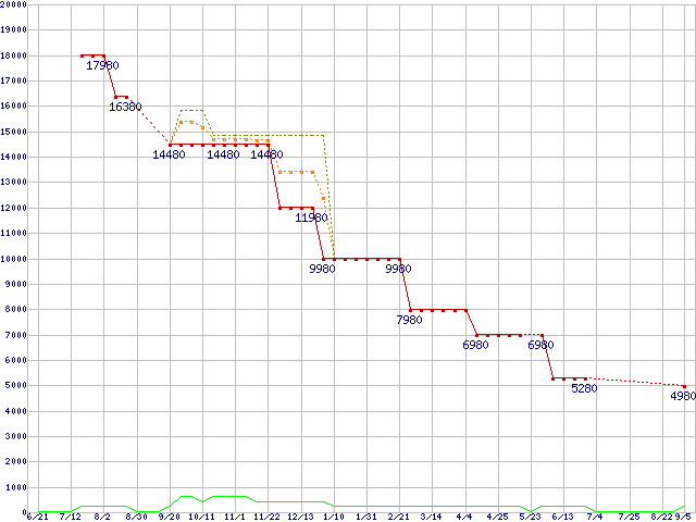 PC3-12800 2GBの価格推移↑前グラフ↓次グラフ(2008年6月21日〜2009年9月5日)※このグラフは過去のデータも税率5%相当に調整した税込み相当額のグラフです。 税率変更や、総額表示方式導入(2004年4月)の影響は除いています。●関連グラフメモリ主要製品の最安値推移1GBモジュールの最安値推移メモリ主要製品(最安値5千円未満)の最安値推移PC3-12800(DDR3-1600) DDR3 SDRAM DIMMの最安値推移●凡例最安値(点線部は販売店未確認または未調査)平均値最高値ショップ数