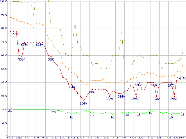PC2-6400 2GB×2枚組みセットの価格推移↑前グラフ↓次グラフ(2008年6月21日〜2009年9月5日)※このグラフは過去のデータも税率5%相当に調整した税込み相当額のグラフです。 税率変更や、総額表示方式導入(2004年4月)の影響は除いています。●関連グラフメモリ主要製品の最安値推移1GBモジュールの最安値推移メモリ主要製品(最安値5千円未満)の最安値推移PC2-6400(DDR2-800) DDR2 SDRAM DIMMの最安値推移●凡例最安値(点線部は販売店未確認または未調査)平均値最高値ショップ数