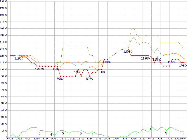 PC2-6400 4GBの価格推移↑前グラフ(2008年6月21日〜2009年9月5日)※このグラフは過去のデータも税率5%相当に調整した税込み相当額のグラフです。 税率変更や、総額表示方式導入(2004年4月)の影響は除いています。●関連グラフメモリ主要製品の最安値推移1GBモジュールの最安値推移メモリ主要製品(最安値1万円以上)の最安値推移PC2-6400(DDR2-800) DDR2 SDRAM DIMMの最安値推移●凡例最安値(点線部は販売店未確認または未調査)平均値最高値ショップ数