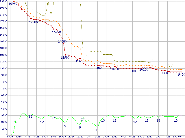 WD1001FALS (1TB,32MB)の価格推移↑前グラフ↓次グラフ(2008年6月19日〜2009年9月3日)※このグラフは過去のデータも税率5%相当に調整した税込み相当額のグラフです。 税率変更や、総額表示方式導入(2004年4月)の影響は除いています。●関連グラフHDD/SSD主要製品の最安値推移HDD/SSD主要製品(最安値1万円未満)の最安値推移HDD 1TB〜1.5TB未満の最安値推移WD Caviar Black (7200rpm,3Gb/s)の最安値推移●凡例最安値(点線部は販売店未確認または未調査)平均値最高値ショップ数