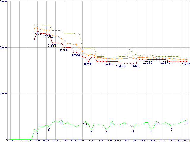 WD1500HLFS (150.0GB)の価格推移↑前グラフ↓次グラフ(2008年6月19日〜2009年9月3日)※このグラフは過去のデータも税率5%相当に調整した税込み相当額のグラフです。 税率変更や、総額表示方式導入(2004年4月)の影響は除いています。●関連グラフHDD/SSD主要製品の最安値推移HDD/SSD主要製品(最安値1万5千円〜2万円未満)の最安値推移HDD 100〜160GB未満の最安値推移WD VelociRaptor (10000rpm,3Gb/s,16MB)の最安値推移●凡例最安値(点線部は販売店未確認または未調査)平均値最高値ショップ数