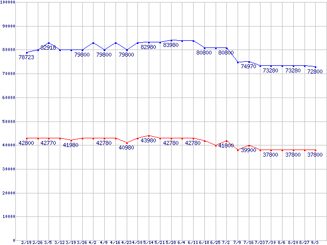 | X25-E Extreme SATA SSD (SSD,3Gb/s,2.5インチ,リード250MB/s・ライト170MB/s)の最安値推移 |