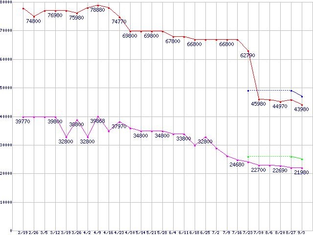 | X25-M Mainstream SATA SSD (SSD,3Gb/s,2.5インチ,リード250MB/s・ライト70MB/s)の最安値推移 |