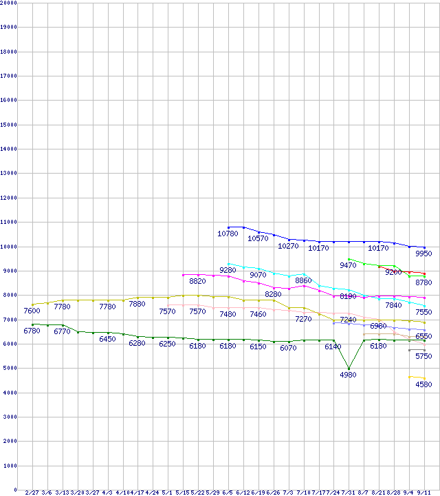 CPU主要製品(最安値1万円未満)の最安値推移↑前グラフ↓次グラフ(2009年2月27日〜2009年9月11日)※このグラフは過去のデータも税率5%相当に調整した税込み相当額のグラフです。 税率変更や、総額表示方式導入(2004年4月)の影響は除いています。凡例Phenom II X2 550 Black Edition (3.1GHz,L2 512KB×2,L3 6MB)Pentium Dual-Core E6500 (2.93GHz,L2 2MB)Phenom II X2 545 (3.0GHz,L2 512KB×2,L3 6MB)Pentium Dual-Core E6300 (2.8GHz,L2 2MB)Athlon II X2 250 (3.0GHz,L2 1MB×2)Pentium Dual-Core E5300 (2.6GHz,L2 2MB)Athlon II X2 245 (2.9GHz,L2 1MB×2)Athlon II X2 240 (2.8GHz,L2 1MB×2)Athlon X2 5050e (2.6GHz,L2 512KB×2)Athlon X2 7850 Black Edition (2.8GHz,L2 512KB×2,L3 2MB)Celeron E3300 (2.5GHz)Celeron E3200 (2.4GHz)※製品名をクリックすると個別のグラフを表示します※点線部は販売店が確認できなかった、または調査データがないことを示します