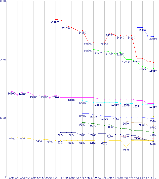 AMD系CPUの最安値推移↑前グラフ↓次グラフ(2009年2月27日〜2009年9月11日)※このグラフは過去のデータも税率5%相当に調整した税込み相当額のグラフです。 税率変更や、総額表示方式導入(2004年4月)の影響は除いています。凡例Phenom II X4 965 Black Edition (3.4GHz,L2 512KB×4,L3 6MB,TDP 140W)Phenom II X4 955 Black Edition (3.2GHz,L2 512KB×4,L3 6MB,TDP 125W)Phenom II X4 945 (3.0GHz,L2 512KB×4,L3 6MB,TDP 95W)Phenom II X3 720 Black Edition (2.8GHz,L2 512KB×3,L3 6MB)Phenom II X3 705e (2.5GHz,L2 512KB×3,L3 6MB)Athlon II X4 620 (2.6GHz,L2 512KB×4)Phenom II X2 550 Black Edition (3.1GHz,L2 512KB×2,L3 6MB)Phenom II X2 545 (3.0GHz,L2 512KB×2,L3 6MB)Athlon II X2 250 (3.0GHz,L2 1MB×2)Athlon II X2 245 (2.9GHz,L2 1MB×2)Athlon II X2 240 (2.8GHz,L2 1MB×2)Athlon X2 5050e (2.6GHz,L2 512KB×2)Athlon X2 7850 Black Edition (2.8GHz,L2 512KB×2,L3 2MB)※製品名をクリックすると個別のグラフを表示します※点線部は販売店が確認できなかった、または調査データがないことを示します